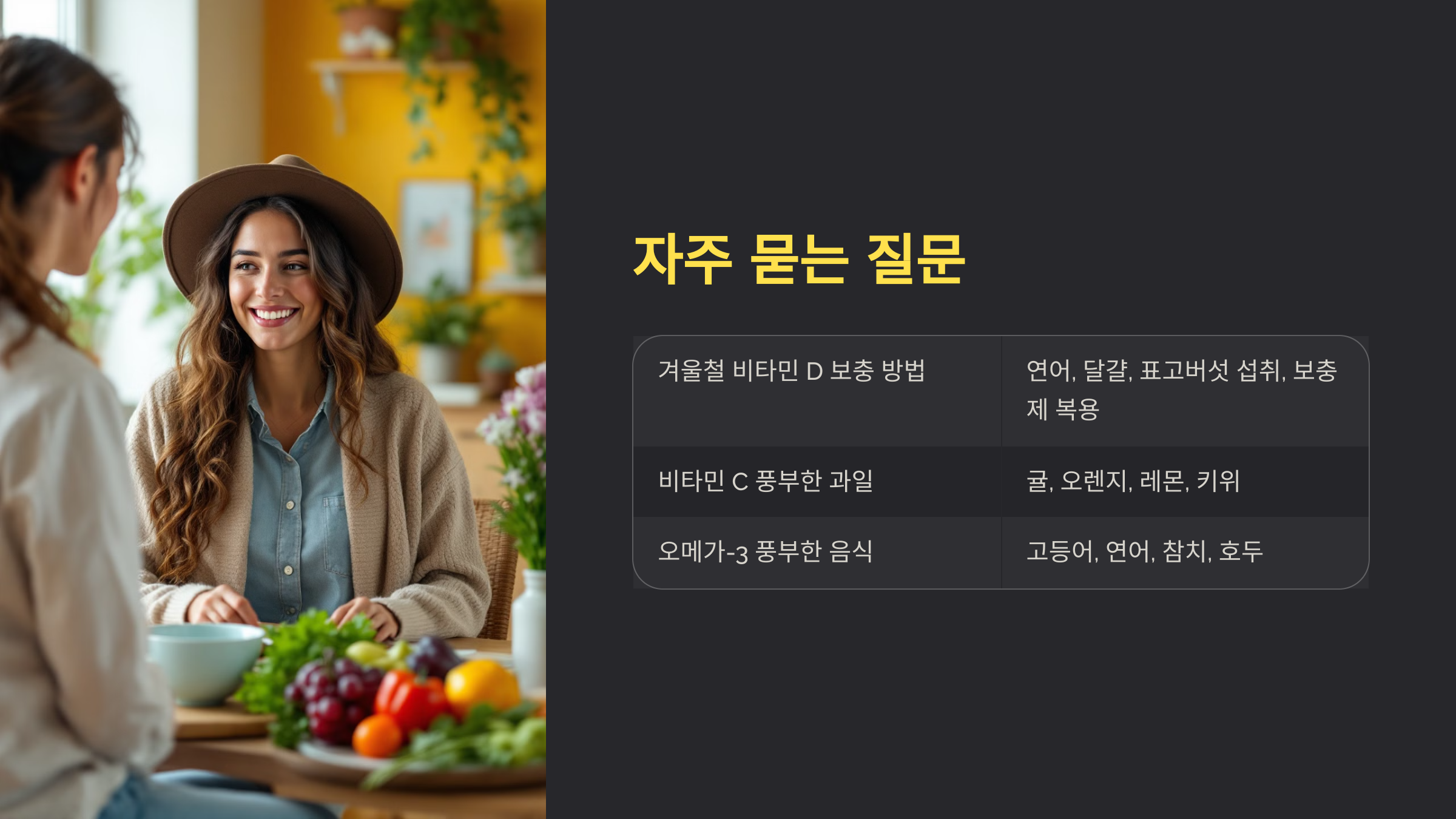 A1: 비타민 D는 햇빛을 통해 합성되지만, 겨울철에는 연어, 달걀, 표고버섯 등 비타민 D가 풍부한 음식을 섭취하거나 보충제를 통해 보충하는 것이 좋습니다.