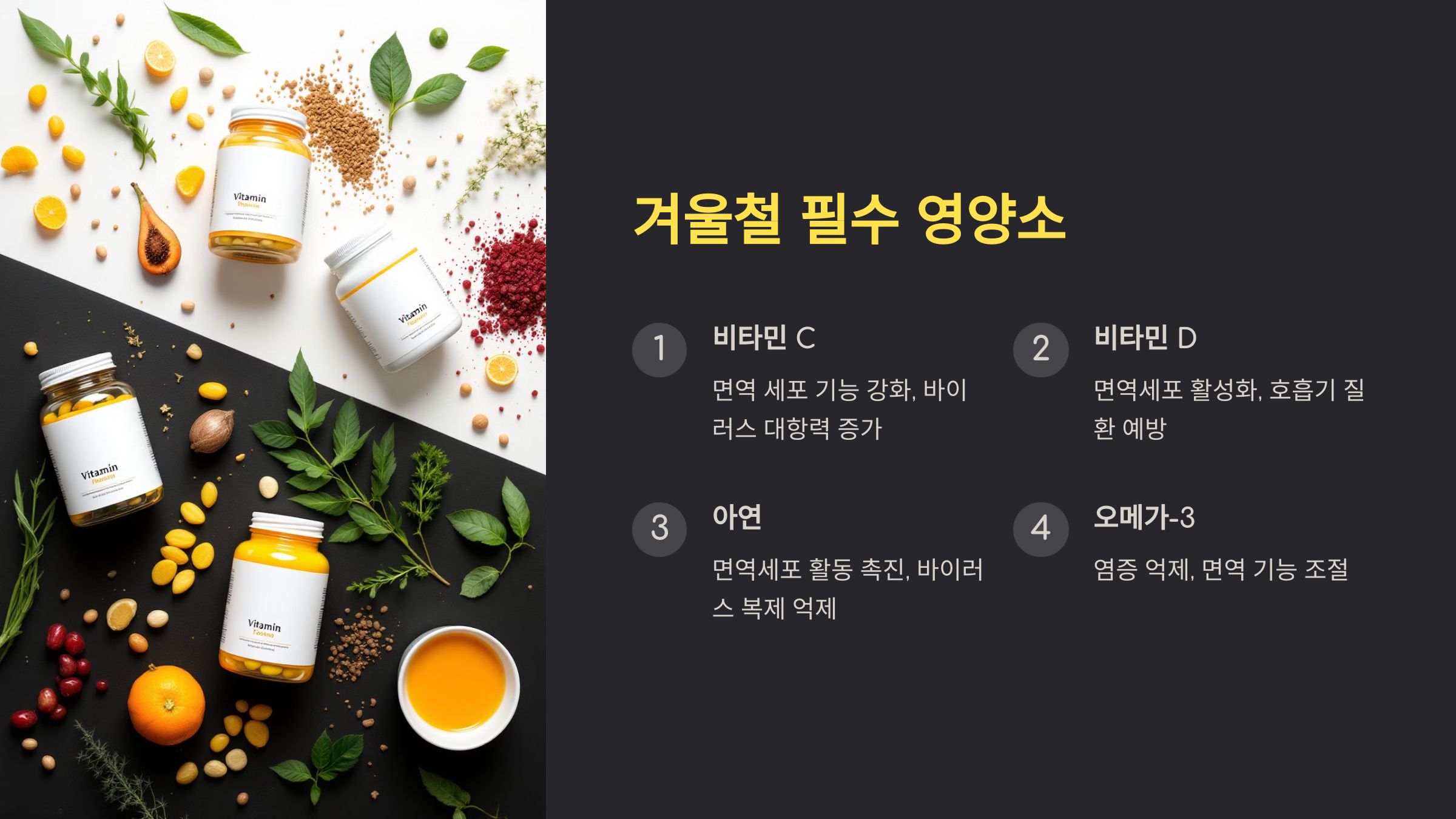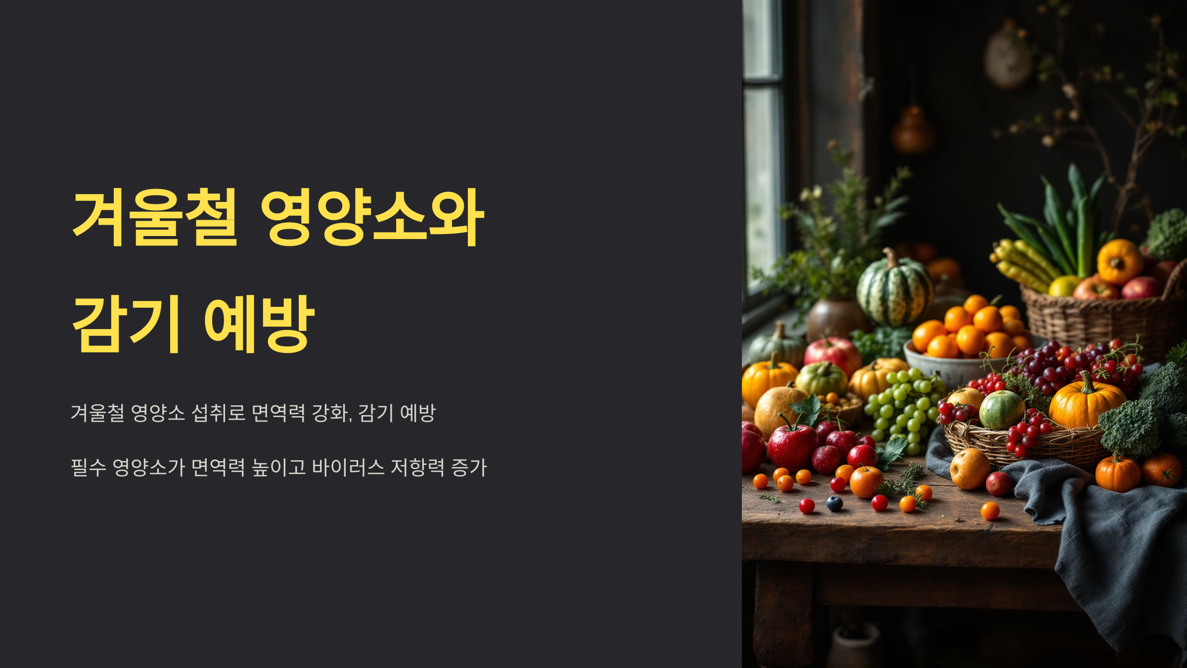겨울철에는 체내 면역력이 약해질 수 있기 때문에 비타민 C, 비타민 D, 아연, 오메가-3 지방산, 프로바이오틱스와 같은 필수 영양소를 충분히 섭취하는 것이 중요합니다. 이러한 영양소들은 면역 기능을 강화하고, 바이러스에 대한 저항력을 높여 감기와 같은 질환을 예방하는 데 큰 도움이 됩니다. 건강한 식단을 통해 겨울철 감기 예방에 힘쓰고, 활기차고 건강한 겨울을 보내시기 바랍니다.