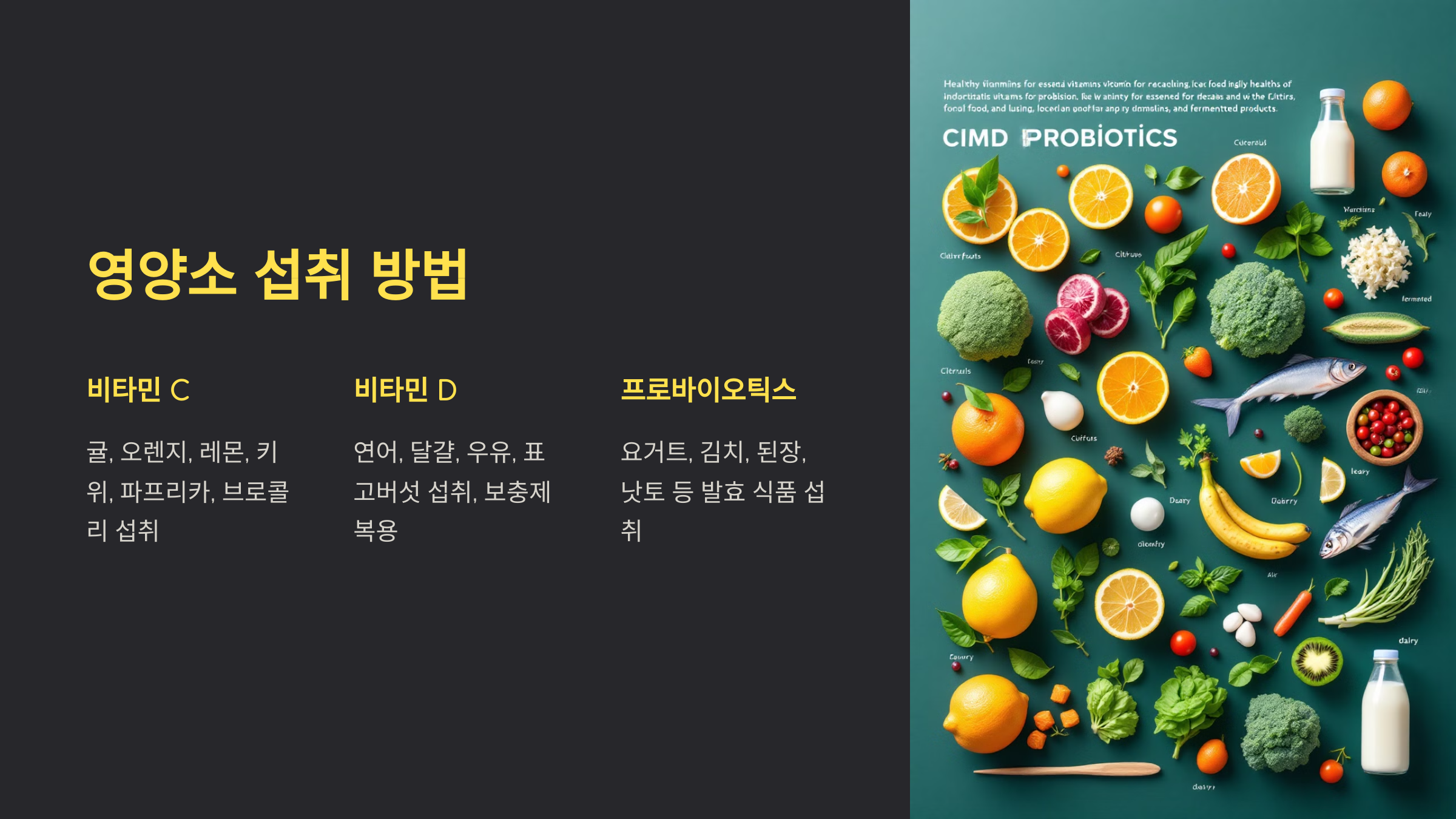 - 섭취 방법: 연어, 달걀, 우유, 표고버섯과 같은 비타민 D가 풍부한 음식을 먹거나, 필요한 경우 비타민 D 보충제를 복용할 수 있습니다.