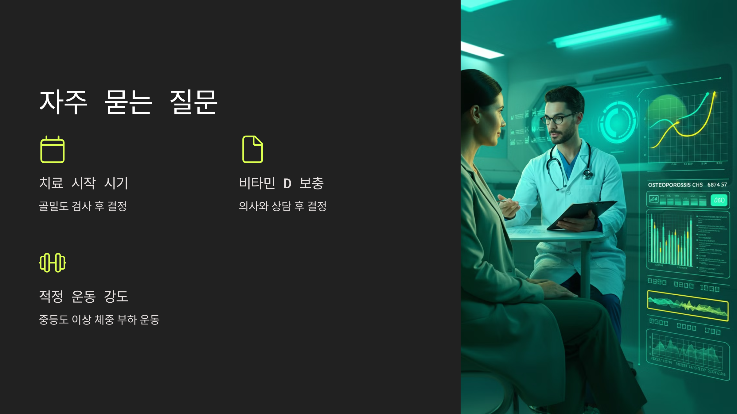 골다공증은 약물 치료, 올바른 영양 섭취, 규칙적인 운동으로 관리할 수 있습니다. 치료는 장기적인 계획이 중요하니, 의사와 상담하며 지속적으로 관리하세요. 작은 습관부터 시작해 건강한 뼈를 만들어 봅시다!