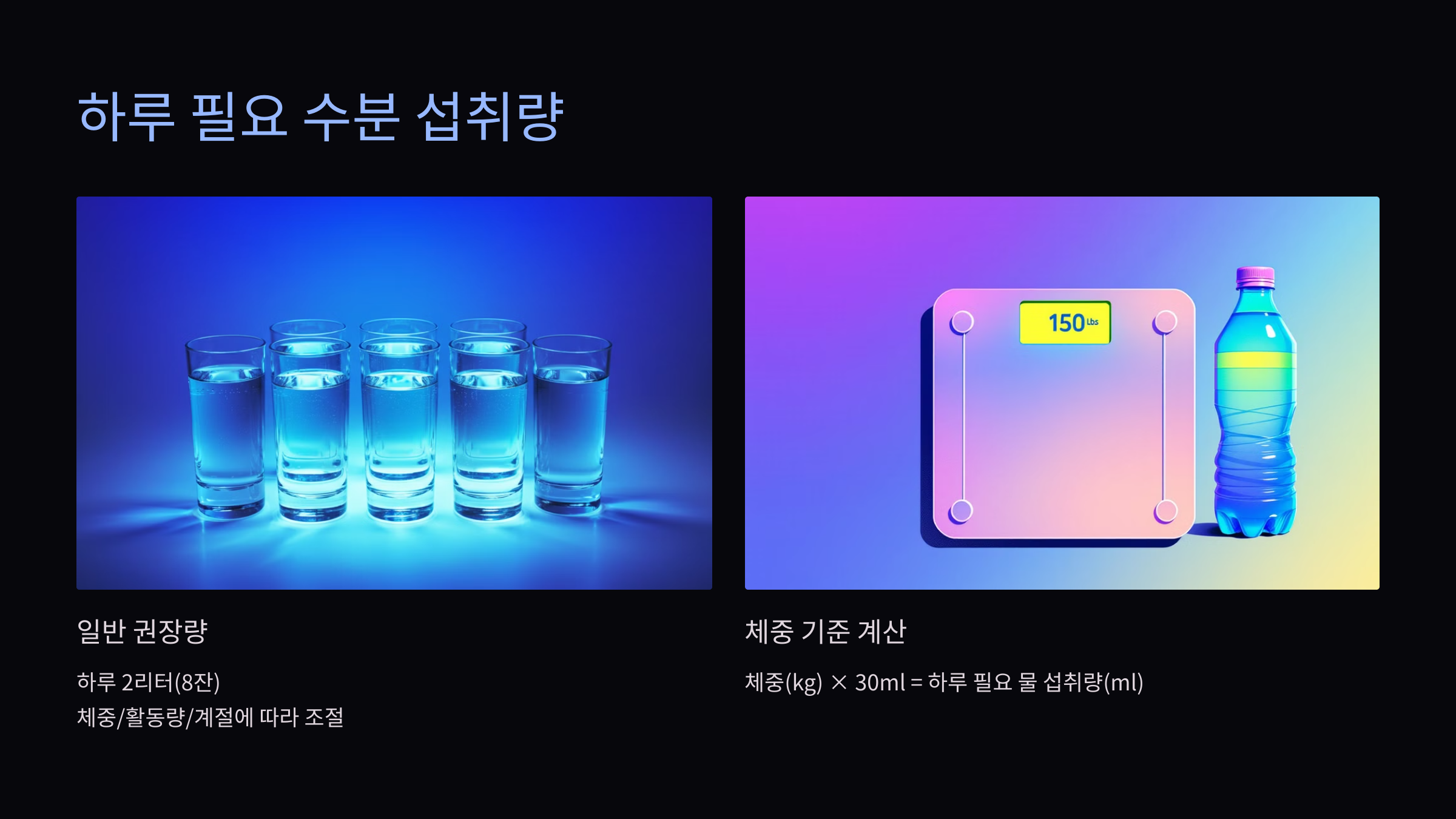 - 하루 필요 물 섭취량(ml) = 체중(kg) × 30ml