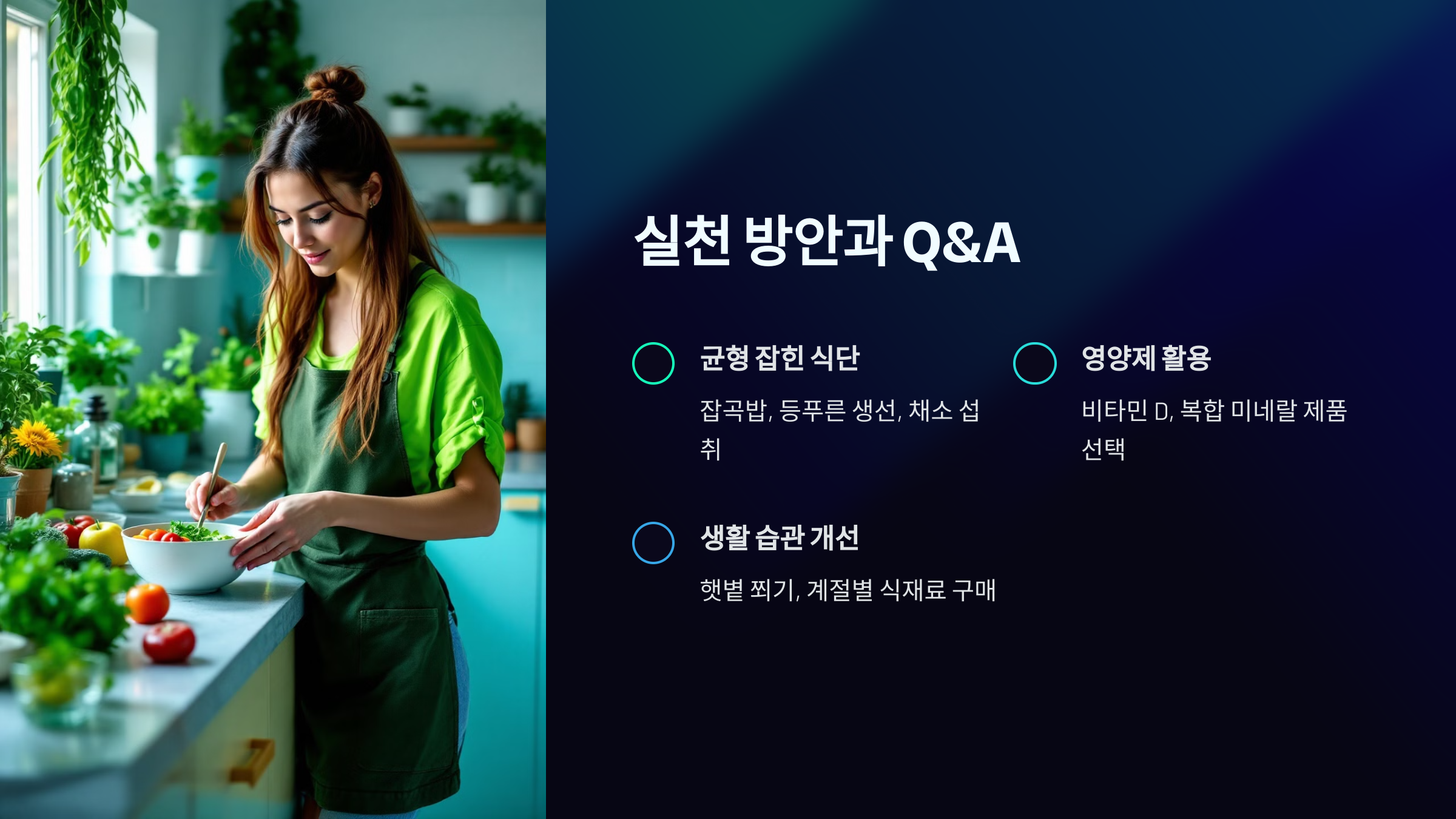 - 실천 방안: 매일 20분 이상 햇볕을 쬐고, 등푸른 생선과 버섯을 자주 섭취하세요.