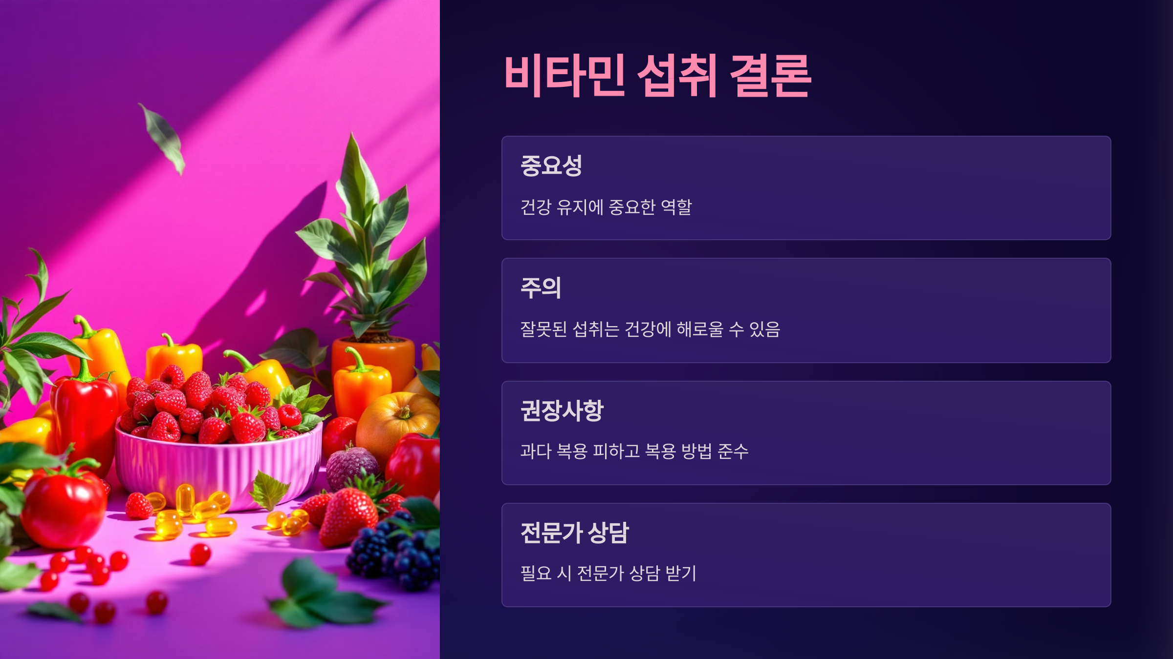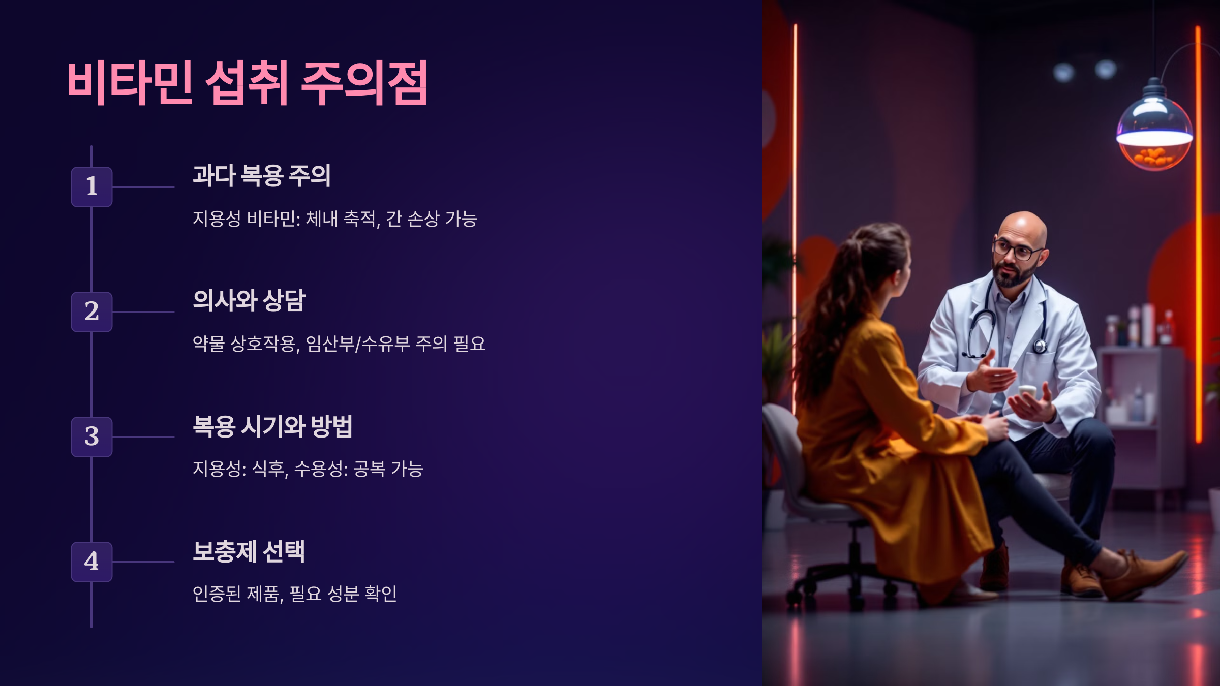 비타민은 건강을 유지하는 데 중요한 역할을 하지만, 잘못된 섭취는 오히려 건강에 해로울 수 있습니다. 과다 복용을 피하고, 복용 시기와 방법을 준수하며, 필요 시 전문가의 상담을 받는 것이 중요합니다. 안전하고 효과적인 비타민 섭취로 건강을 지켜나가세요!