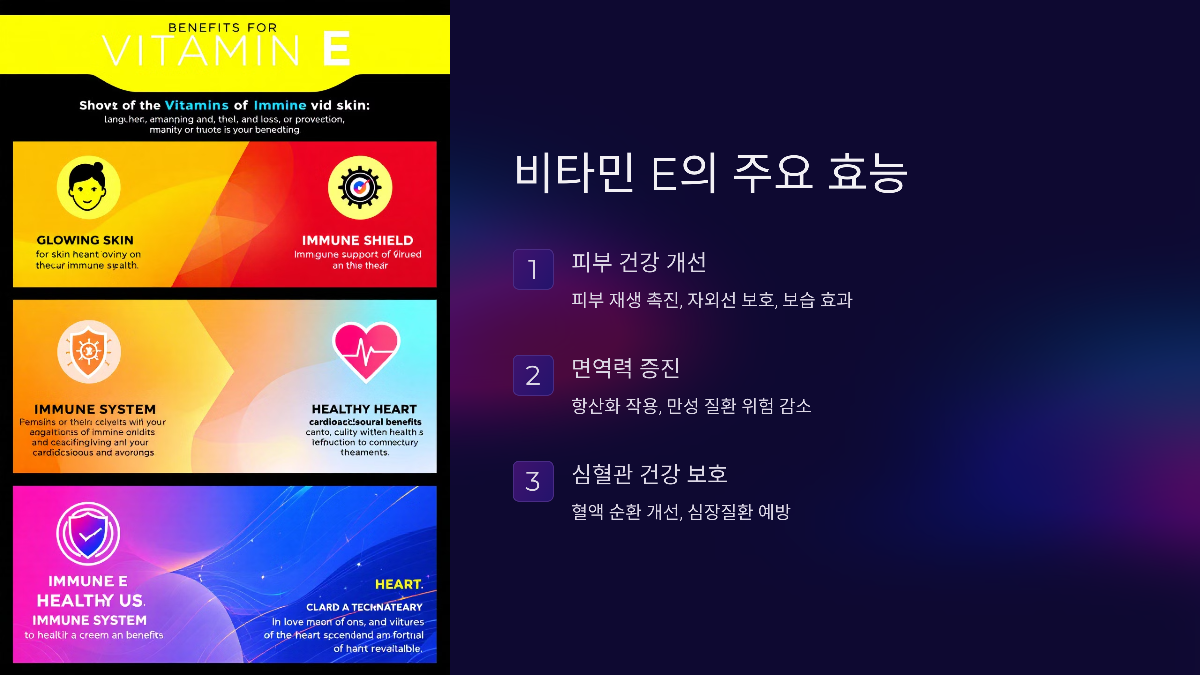 비타민 E는 혈액 순환을 개선하고, 혈관의 건강을 지켜줍니다. 심장질환 예방에도 기여하며 혈관 벽을 튼튼하게 만들어줍니다.