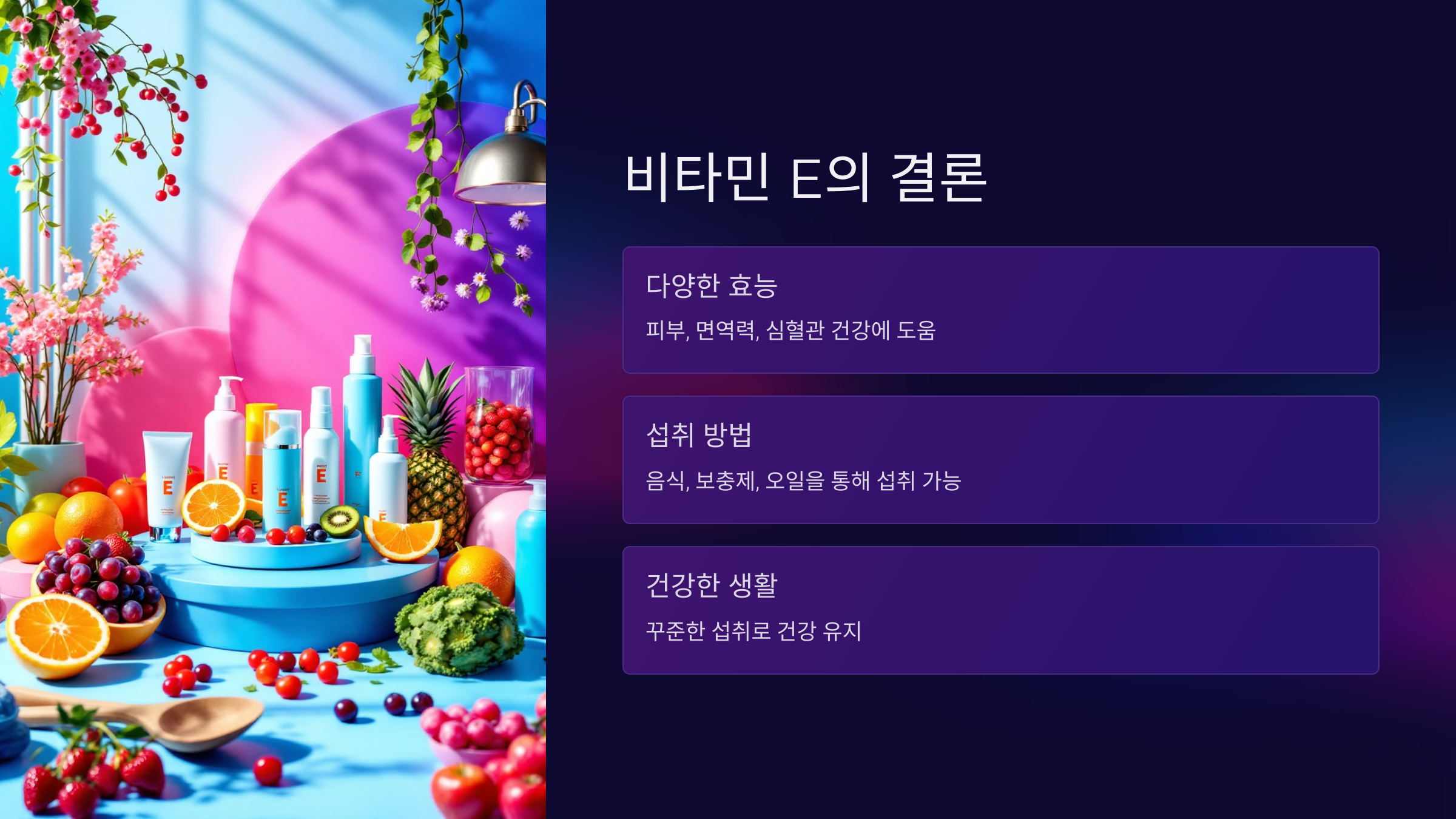 비타민 E는 피부와 면역력, 심혈관 건강에 이르기까지 다양한 효능을 제공합니다. 음식이나 보충제, 오일을 통해 손쉽게 섭취할 수 있으며, 꾸준히 섭취하면 건강한 생활을 유지하는 데 큰 도움이 됩니다. 여러분도 비타민 E를 일상 속에서 적극 활용해 보세요! 😃