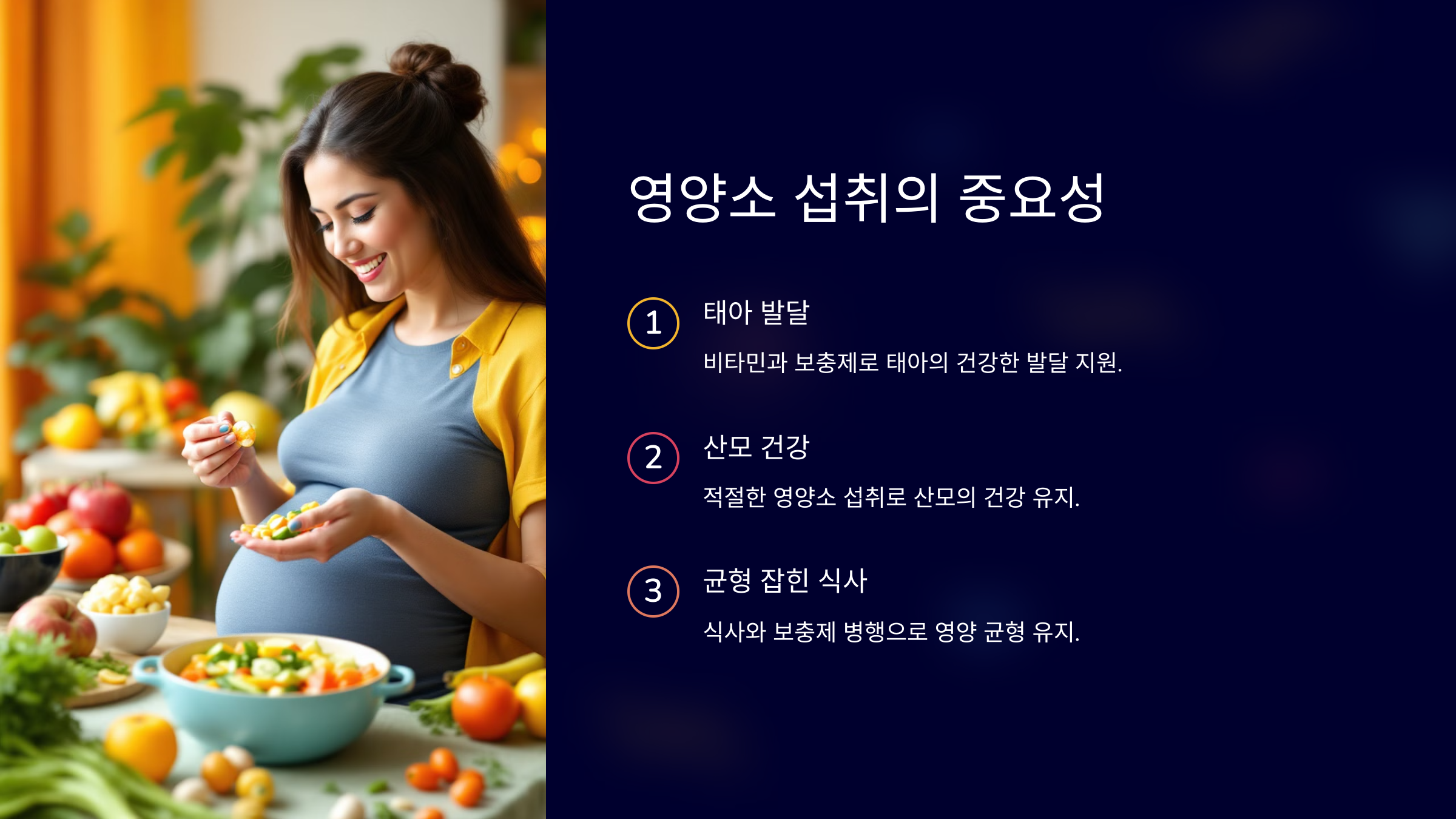 임신 중에는 엽산, 철분, 칼슘, 비타민 D, 오메가-3 등 중요한 비타민과 보충제를 충분히 섭취하는 것이 중요합니다. 이러한 영양소는 태아의 건강한 발달을 돕고, 산모의 건강도 지켜줍니다. 균형 잡힌 식사와 함께 필요 시 전문가와 상의하여 보충제를 선택하는 것도 좋은 방법입니다. 임신 기간 동안 적절한 영양소 섭취로 건강한 임신 생활을 유지하세요!