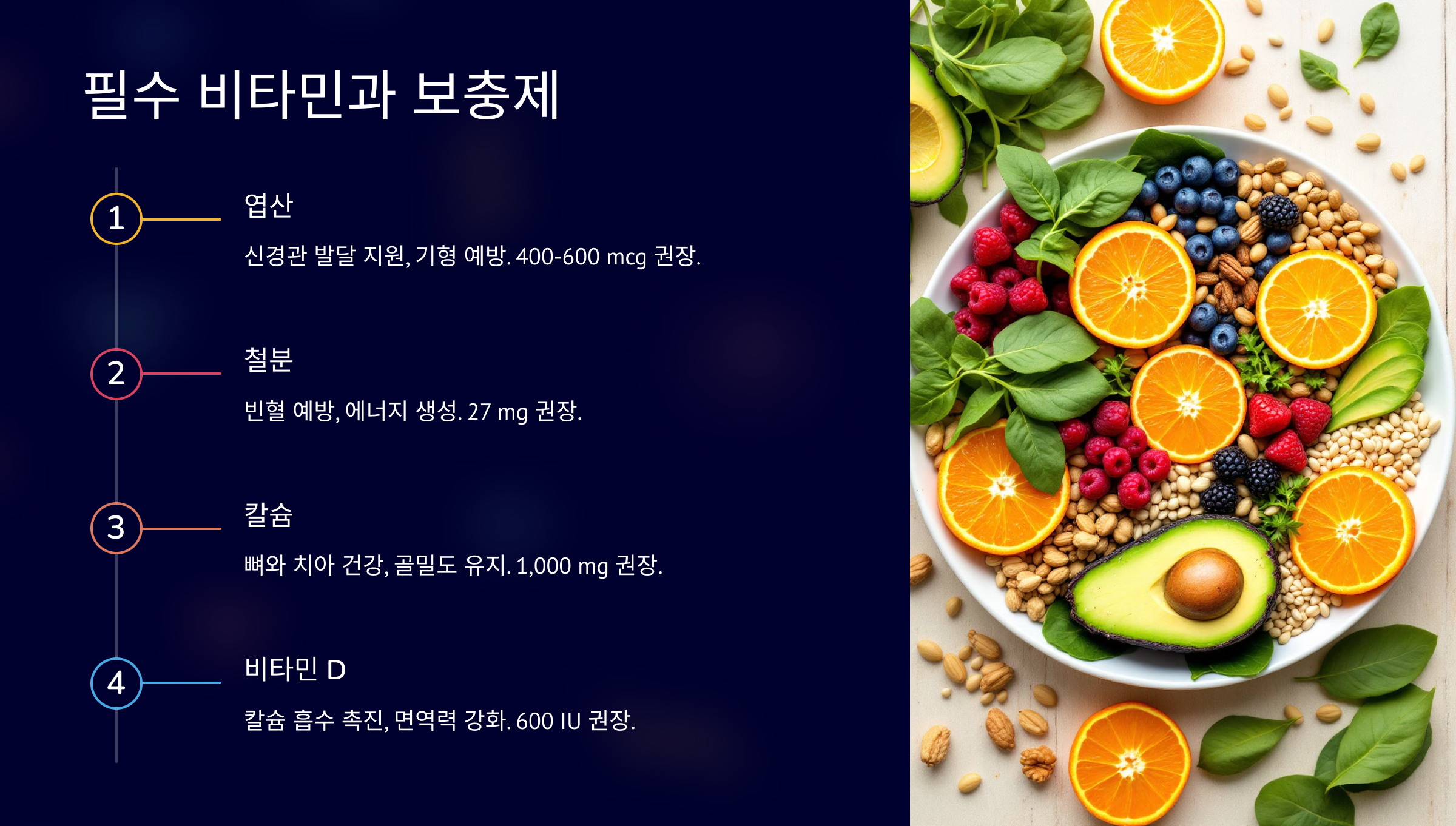 임신 중에는 산모와 아기의 건강을 위해 영양소 섭취가 매우 중요합니다. 특히 비타민과 특정 미네랄은 아기의 성장과 발달에 필수적인 역할을 합니다. 이번 글에서는 임산부가 꼭 섭취해야 하는 비타민과 보충제를 소개하고, 그 중요성에 대해 알아보겠습니다.