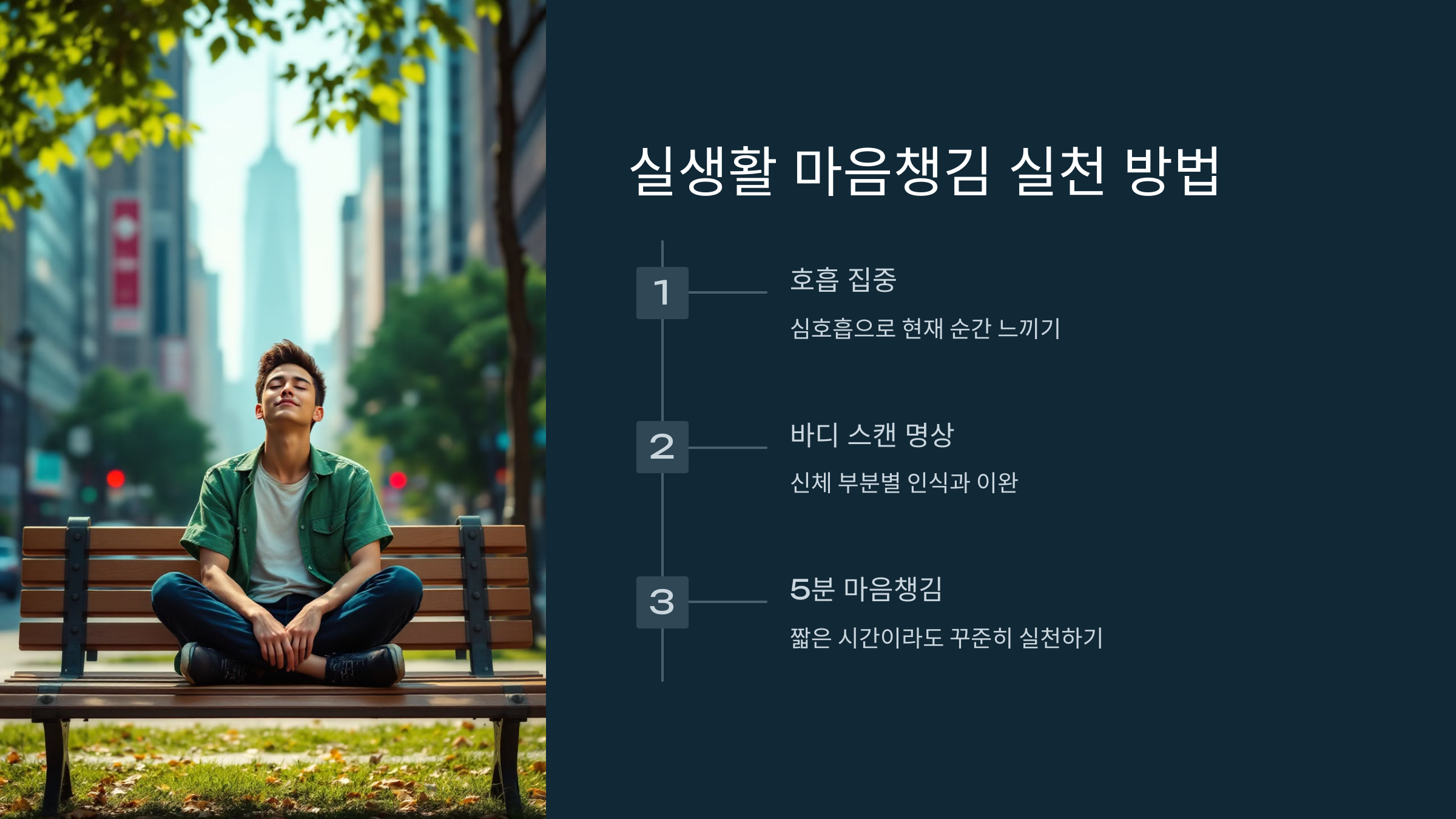 가장 기본적인 마음챙김 훈련은 호흡에 집중하여 현재 순간을 느끼는 것입니다. 심호흡을 하며 호흡의 리듬에 주의를 기울이는 것만으로도 마음이 차분해지고, 스트레스를 완화할 수 있습니다. 이 간단한 훈련은 일상 속에서도 쉽게 적용할 수 있어 꾸준한 실천이 가능합니다.