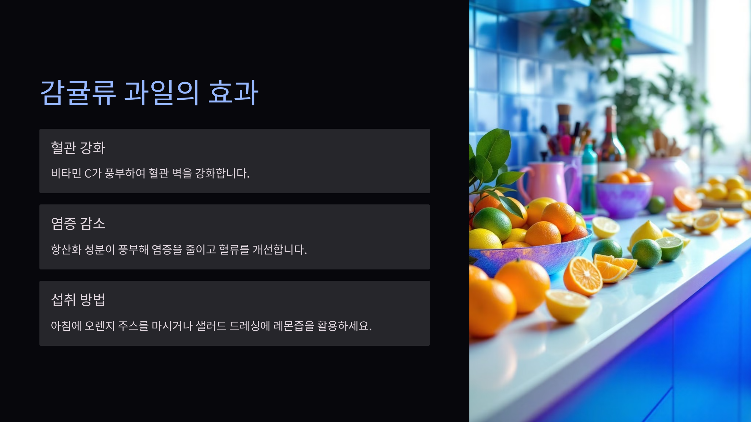 비타민 C가 풍부한 감귤류 과일은 혈관 벽을 강화하고 염증을 줄입니다. 항산화 성분이 풍부해 혈류를 원활히 하는 효과가 있습니다.