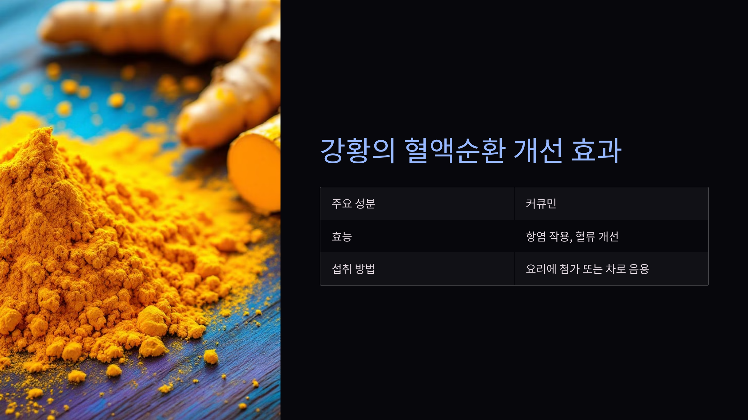 - 강황차를 마시면 혈액순환 개선에 더욱 효과적입니다.