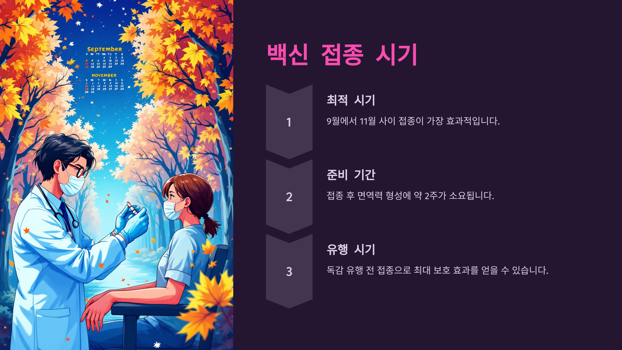 - 가을 초반인 9월에서 11월 사이에 접종하는 것이 가장 효과적입니다.