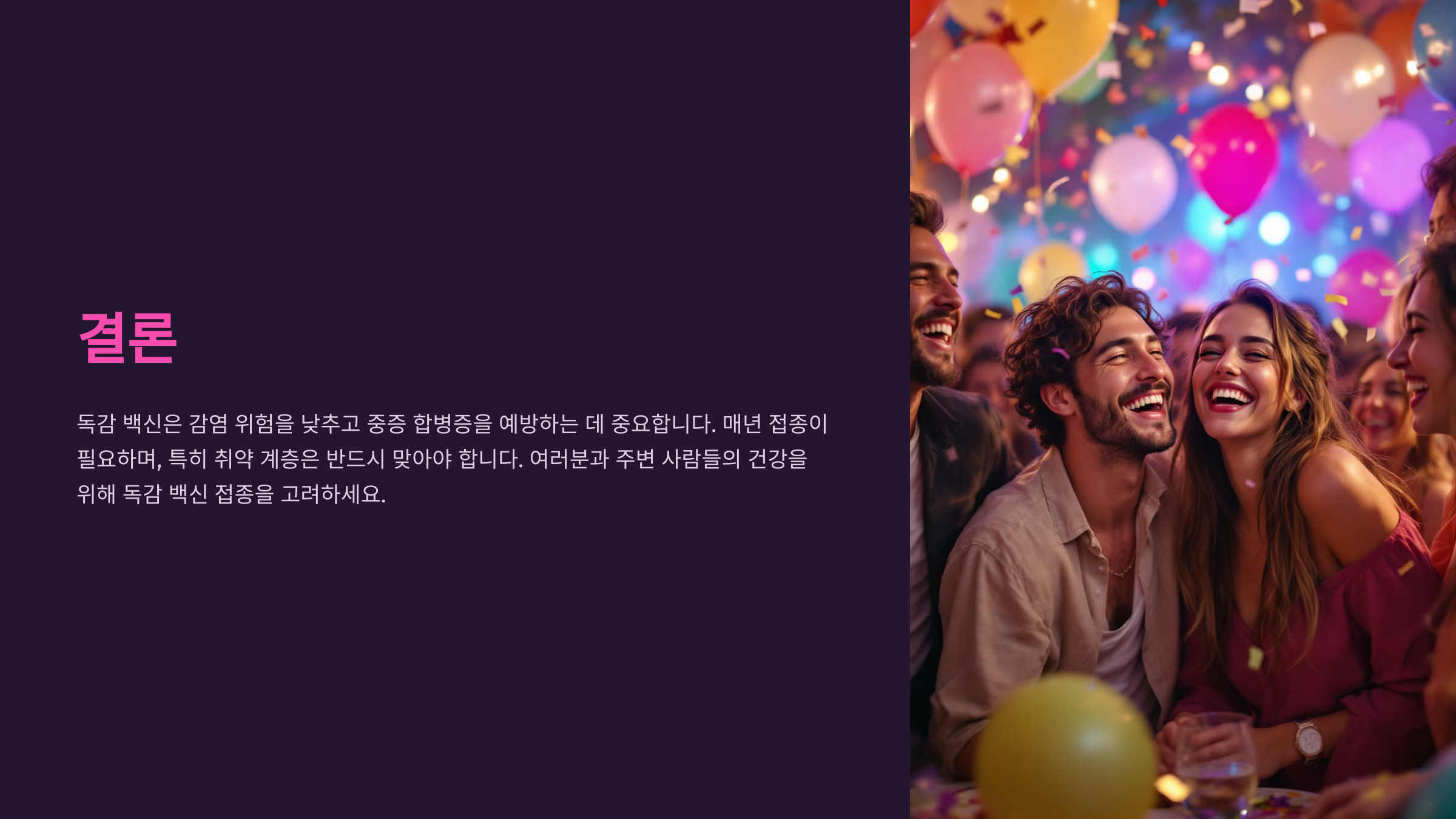 독감 백신은 감염을 완전히 막지는 못하더라도, 감염 위험을 낮추고 중증 합병증을 예방하는 데 중요한 역할을 합니다. 특히 매년 접종이 필요하며, 노인과 어린이 등 취약한 계층은 반드시 백신을 맞아야 합니다. 여러분의 건강과 주변 사람들의 안전을 위해 독감 백신 접종을 고려해보세요!